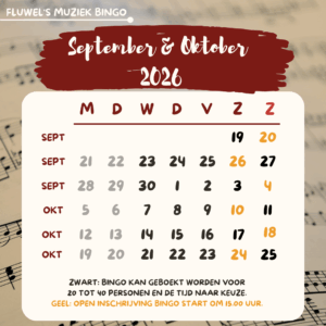 Fluwel’s Muziek Bingo is te boeken op de data die in de kalender is weergegeven. Maandag en dinsdag zijn wij gesloten. Woensdag tot en met zondag is het altijd op aanvraag, de Bingo gaat door wanneer er 20 aanmeldingen zijn. Er is ruimte voor maximaal 40 personen. 20, 26 september en 4, 10,18 en 14 oktober 2026 is er een open inschrijving voor de bingo die om 15.00 uur start.